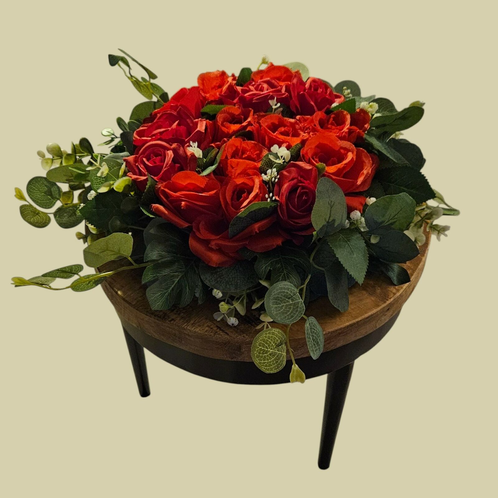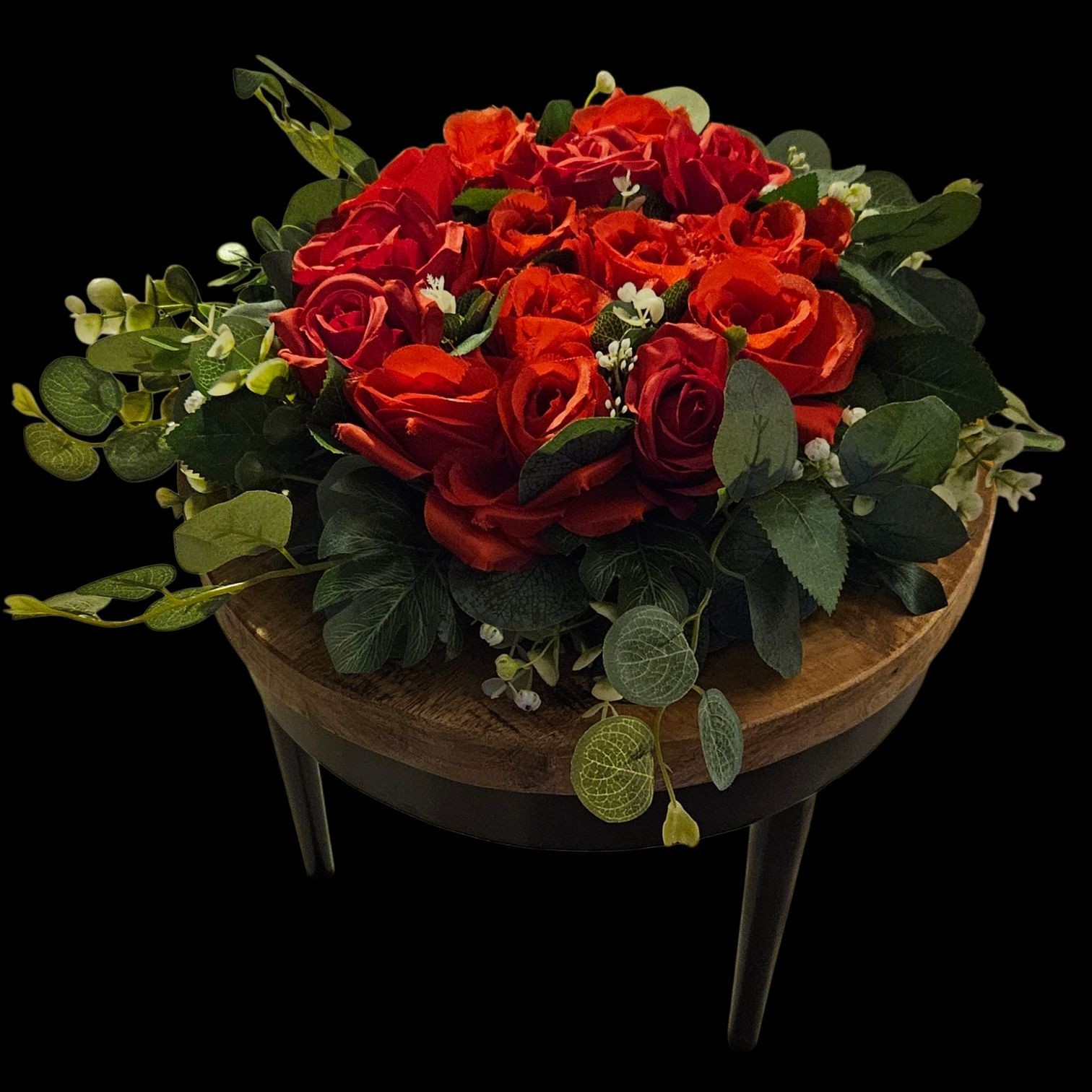 “Voor altijd in liefde” is een indrukwekkend rouwstuk met volle, dieprode rozen – hét symbool van eeuwige liefde en verbondenheid. De rijke kleuren, omlijst door groene accenten en subtiele witte details, brengen kracht, warmte en tederheid samen in één gedenkbloemstuk.